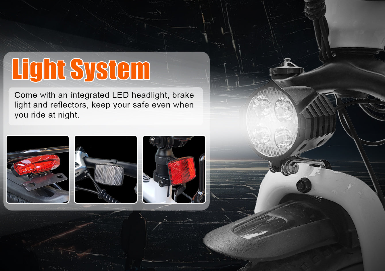 Package Include 1 x Electric Bike, 2 x User Manual, 1 x Charger, 1 x Rear Rack, 2 x Pedal, 2 x Reflector, 2 x Spoke Reflector, 2 x Mudguard, 1 x Headlight, 1 x Saddle, 1 x Lock, 1 x Phone Mount, 1 x Pump, 1 x LCD Display, 1 x Tool Kit